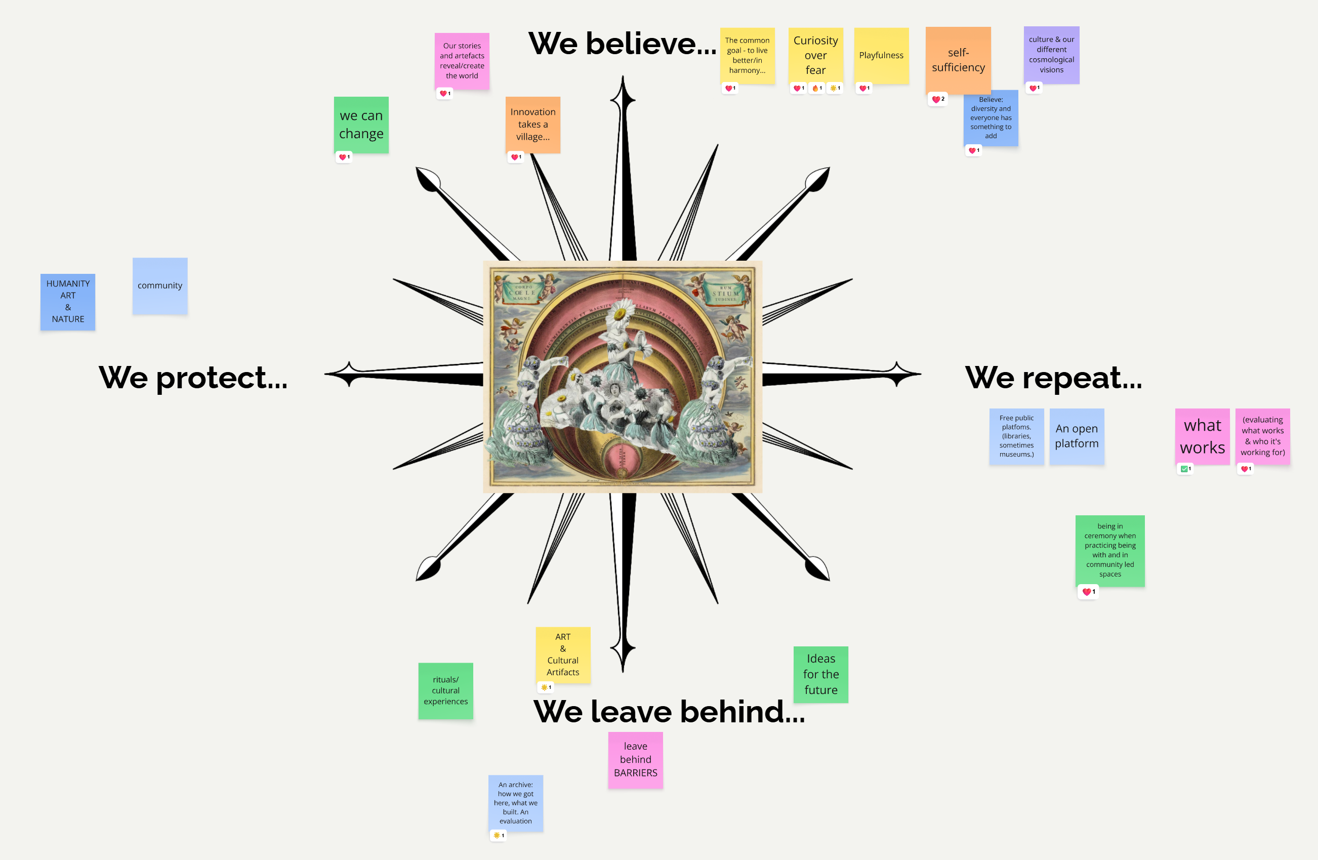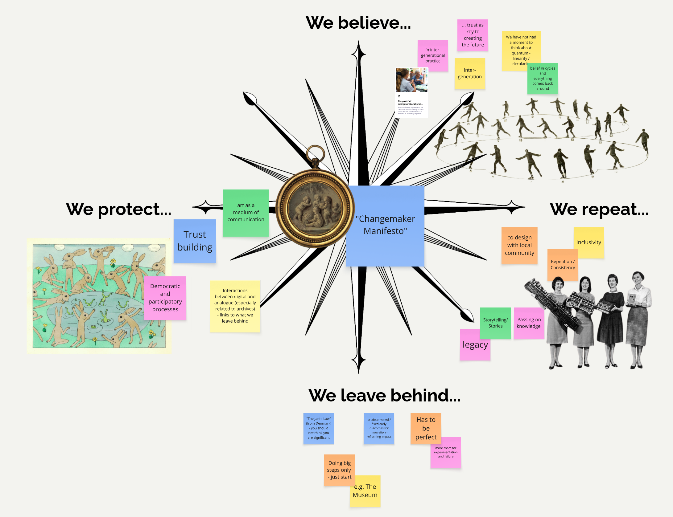 They developed collaborative practices and compasses for innovation that tackle recurring frustrations in collaboration, such as rigid hierarchies, gaps between ideas and needs, barriers to creatives, fear of change, slow pace or inertia, and chaos. Shared values such as courage, playfulness, sharing, and democratic processes emerged from the many ideas of how to better practice and ritualise collaboration.